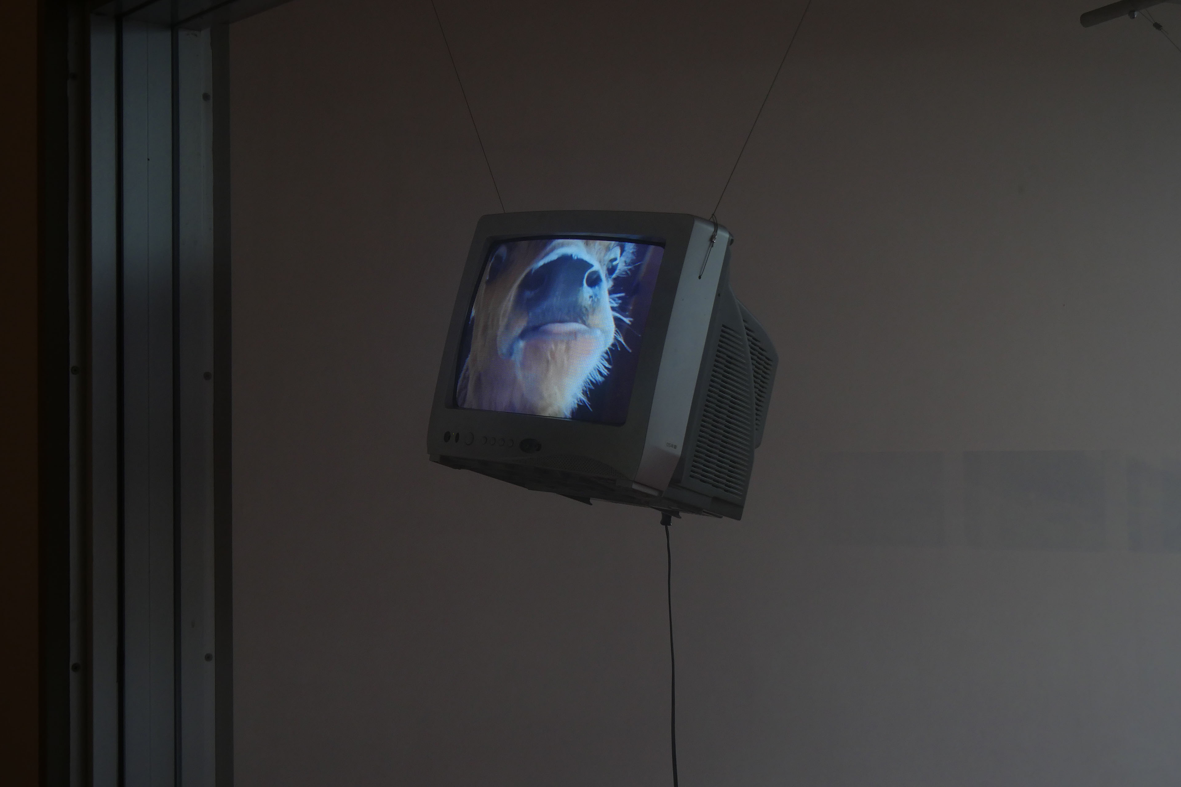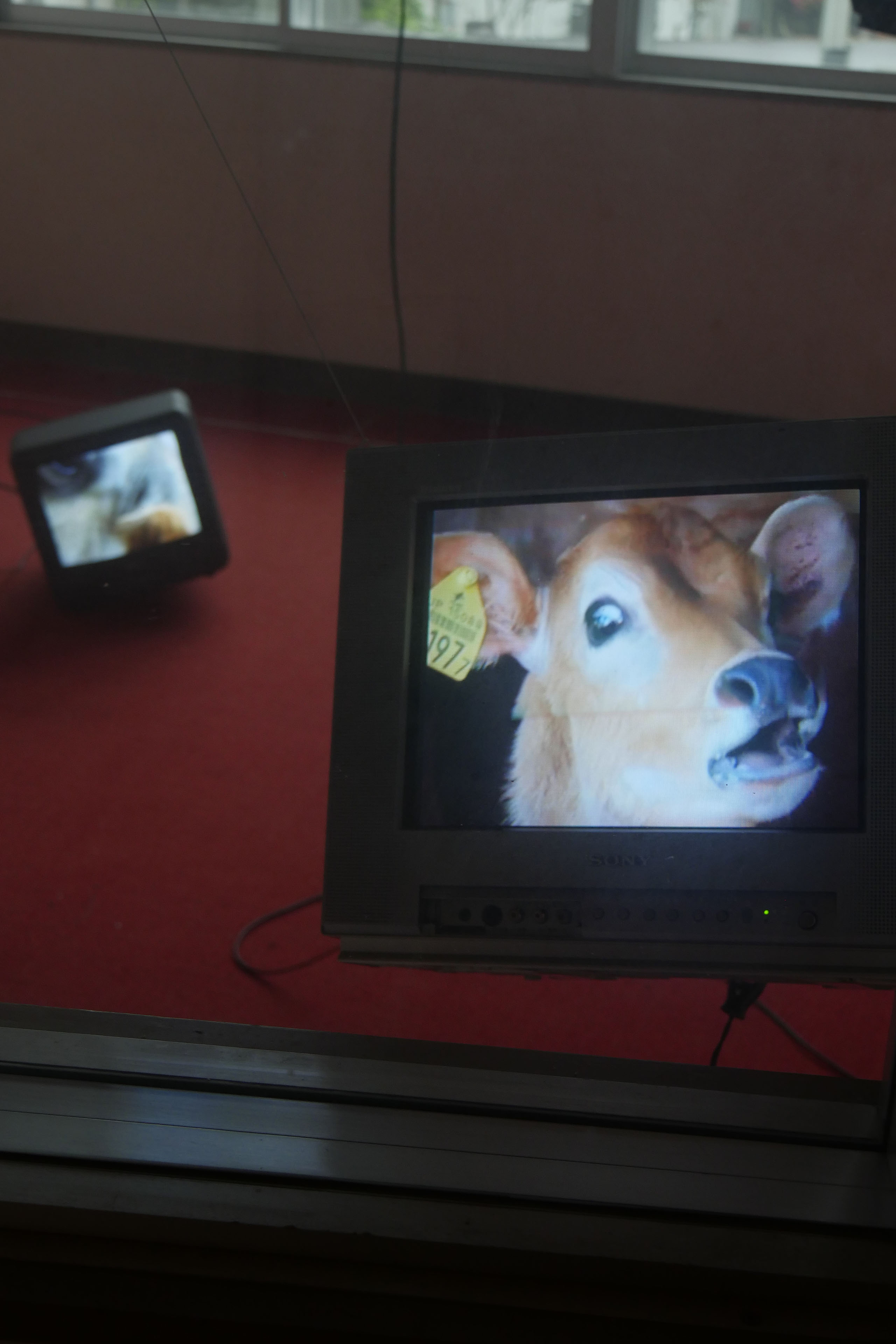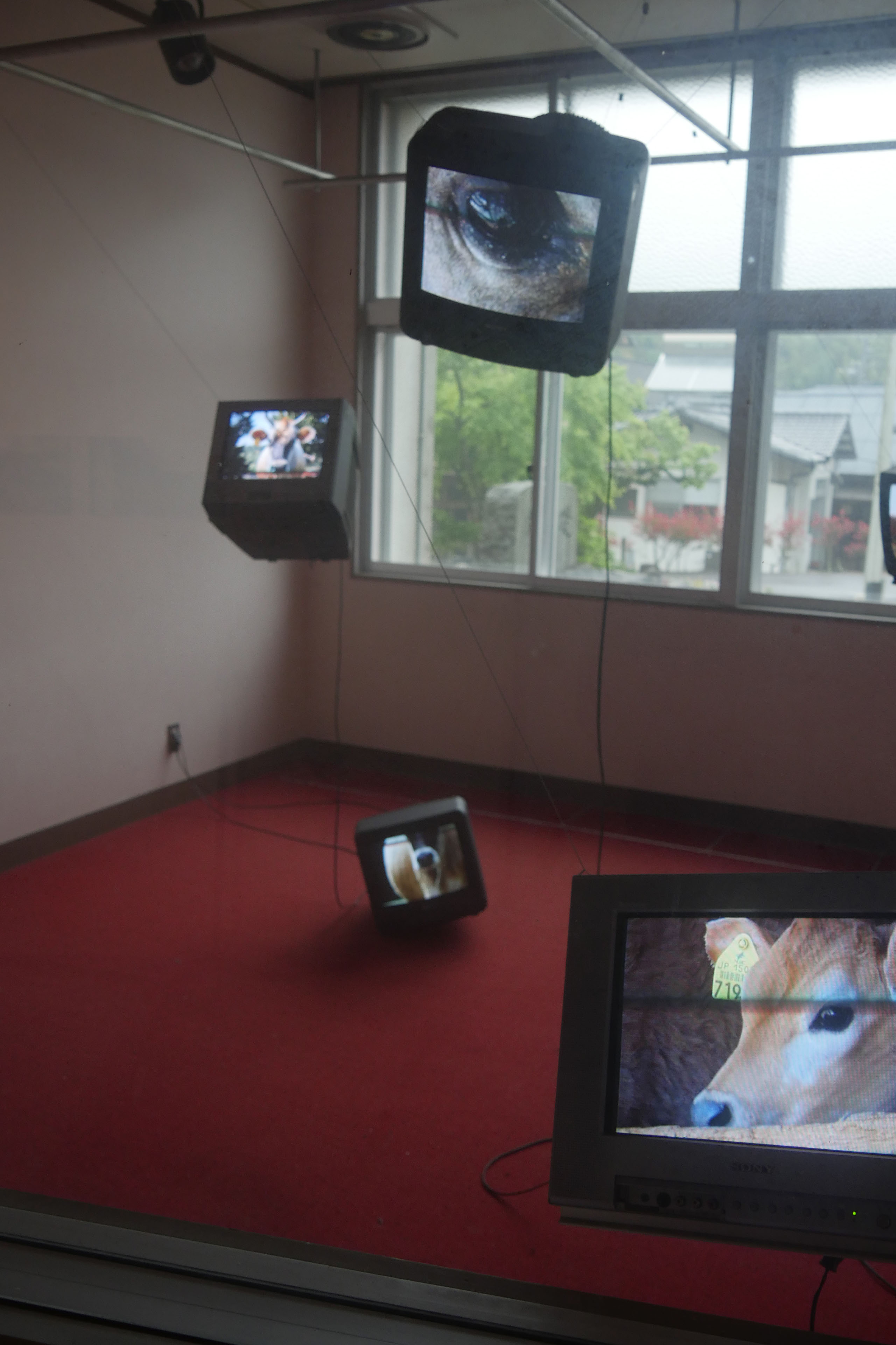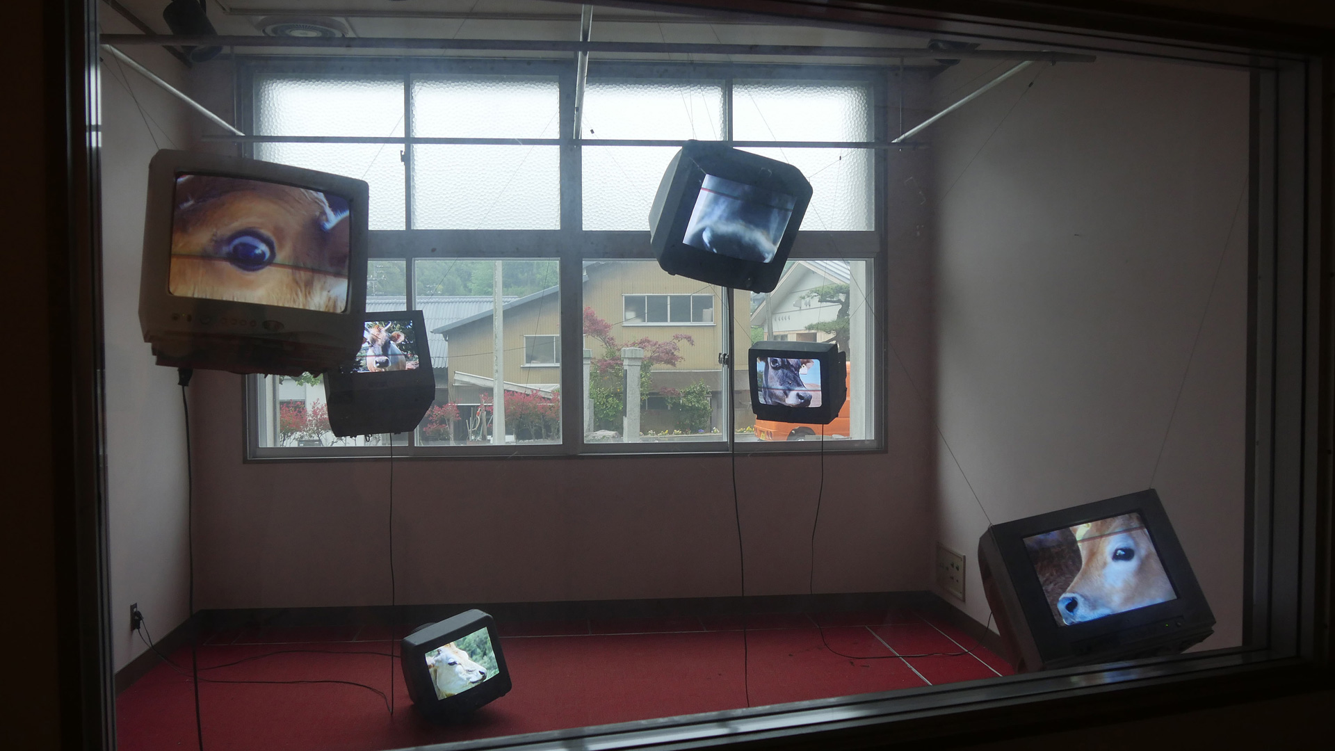 廃校をリノベーションした会場monohouseのかつて放送室だった場所に、6台のモニターを天井から吊り下げ、近くの牧場で撮影した牛を鳴き声とともに閉じ込めた映像インスタレーション作品。綾川町の方々に暖かく迎えられた一方で、この土地の異物として圧倒的によそ者に対する視線を送りつけてくる相手が牛たちだった。「今との対話」という綾川町エリアの展示テーマのもと、UFOに乗って現れた宇宙人のごとく牛に接触することでコミュニケーションの可能性を試みた。
